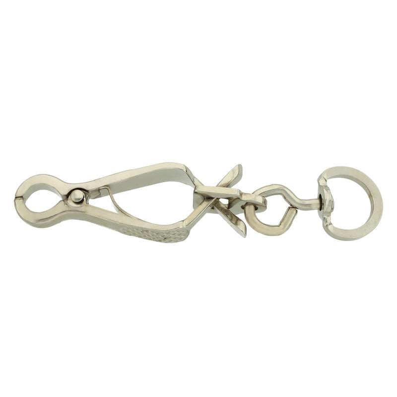 Klešťová karabina s půlkulatým otočným okem. Díky rychlovypouštěcímu mechanizmu umožňuje vypuštění psa v plném tahu.